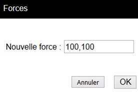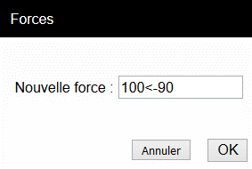 Dans la boîte de dialogue qui apparaît, saisir la nouvelle force que vous souhaitez introduire (toutes les nouvelles forces auront cette caractéristique). La syntaxe utilisée est la suivante intensité < angle, comme pour les coordonnées polaires. 100<-90 indique une force de magnitude 100 dirigée vers le bas. Si vous avez une force et que vous souhaitez introduire une force exactement opposée (tournée de 180°), vous pouvez simplement ajouter un « - » devant l’amplitude. |